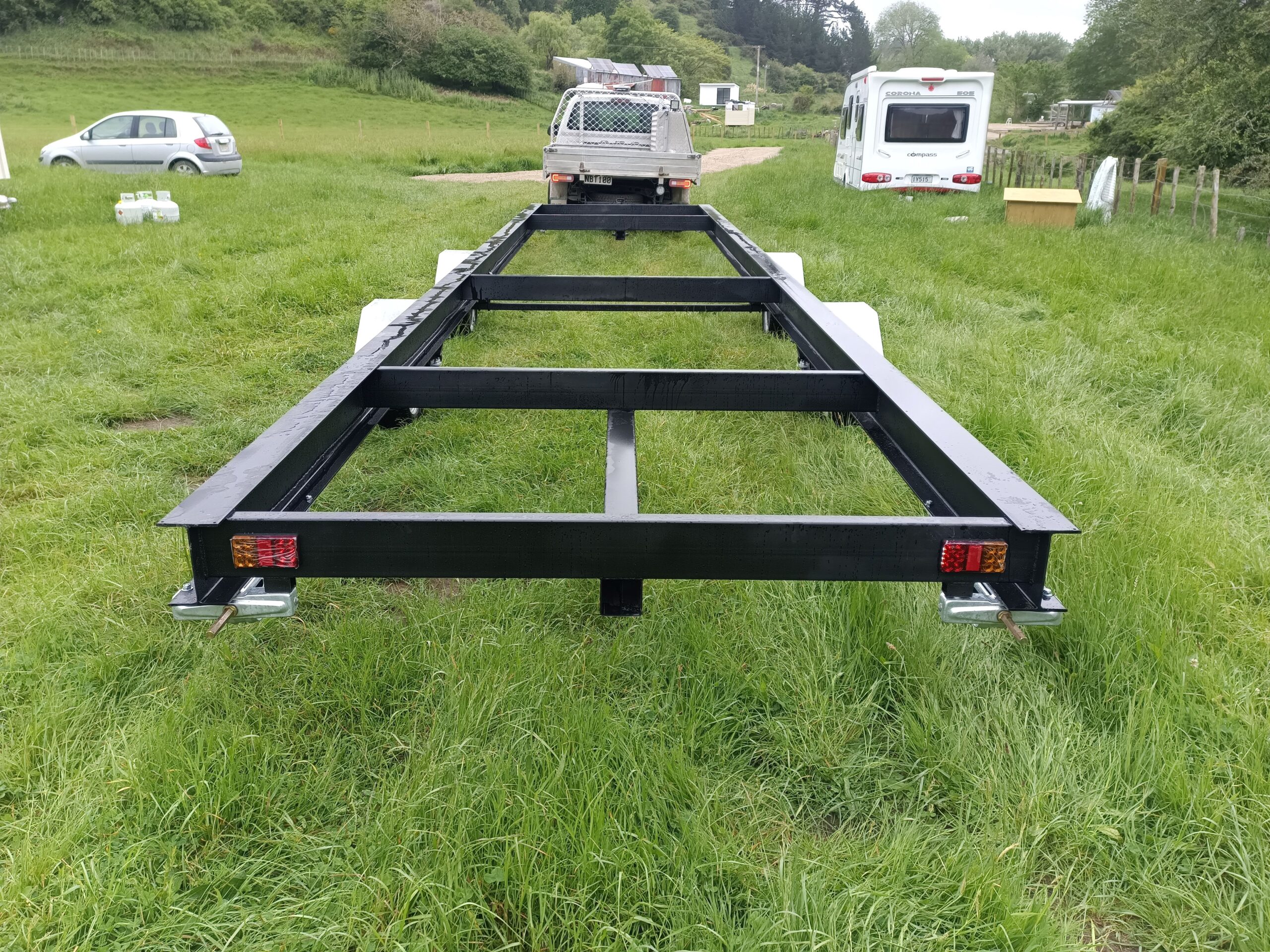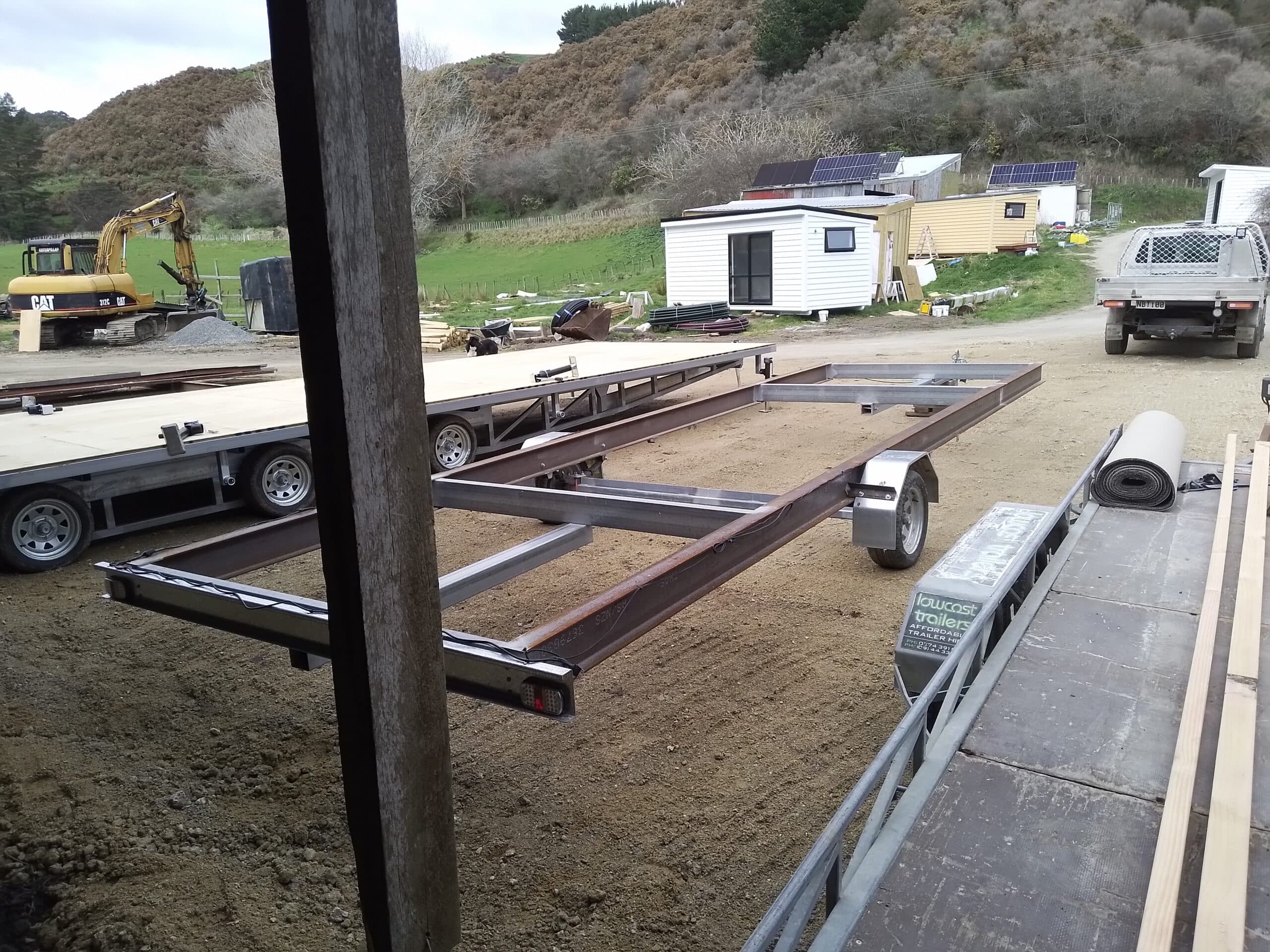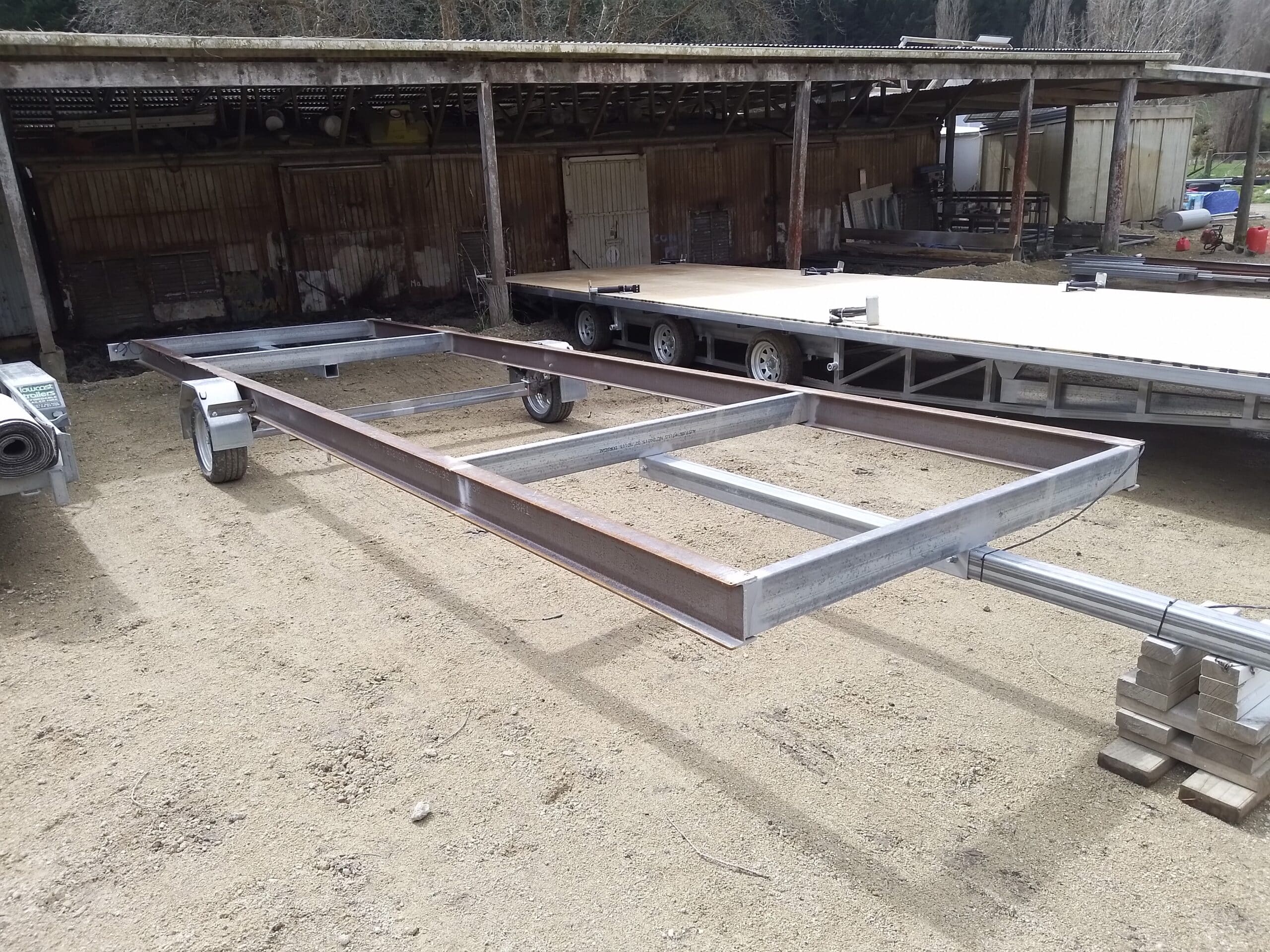 We take big, strong 200UB18 beams (whereas others use 150UB14 beams at half the strength!), put some wheels under it, and call it a day. Less labour, less cost. These trailers are a particularly good and cost-effective fit for existing cabins with a timber framed sub-floor. We drill holes in the beam free of charge and you screw the floor joists directly to the beams. Easy.