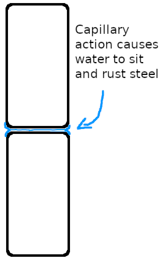Steel rusts when it’s wet. When two box sections are lapped, meaning one section put against another, water from rain or condensation can get sucked between the sections via capillary action, and will dry very slowly. As soon as cold weather hits, condensation forming on the steel will get sucked in, and make these areas wet again. This moisture, with time, will rust the steel.